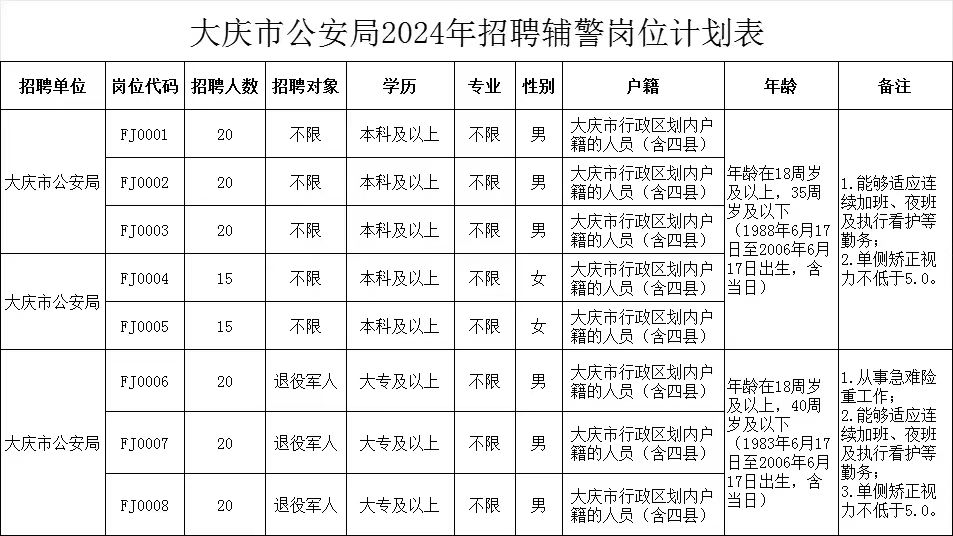 此次公開招聘輔警共計150人,具體招聘崗位、人數、條件等詳見《大慶市公安局2024年招聘輔警崗位計劃表》(附件1)。