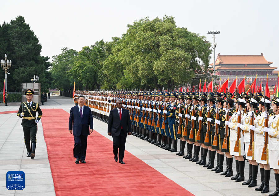??7月10日下午,國家主席習近平在北京人民大會堂同來華進行國事訪問的幾內亞比紹總統恩巴洛舉行會談。這是會談前,習近平在人民大會堂東門外廣場為恩巴洛舉行歡迎儀式。新華社記者 丁林 攝